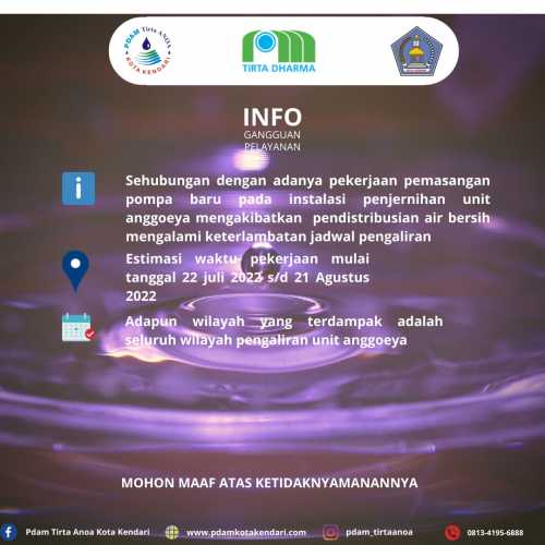 PEBERITAHUAN Sehubungan dengan adanya pemasangan pompa baru pada Unit Andonohu maka pendistribusian air mengalami perubahan jadwal dari yang sebelumnya 1 hari menjadi 2 hari sekali. Jadwal pendistribusian kembali normal jika pekerjaan pemasangan ...