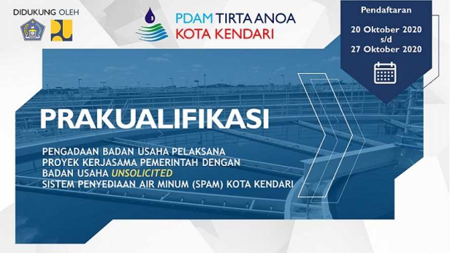 Perusahaan Daerah Air Minum (PDAM) Tirta Anoa Kota Kendari mengundang badan usaha nasional maupun asing untuk mengikuti prakualifikasi pengadaan badan usaha pelaksana Proyek Kerjasama Pemerintah dengan Badan Usaha Unsolicited&...